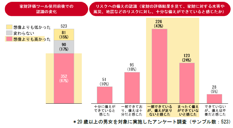 『かんたん家財評価ツール』を使用した後に、家財評価額が想像より高かったと感じる割合は約70%にのぼります。また約70%のお客さまが、リスクへの備えが「まったくできていない」または「足りない」と感じています。『かんたん家財評価ツール』を活用することにより、お客さまが当初想像していなかったリスクを認識していただくことが可能となります。