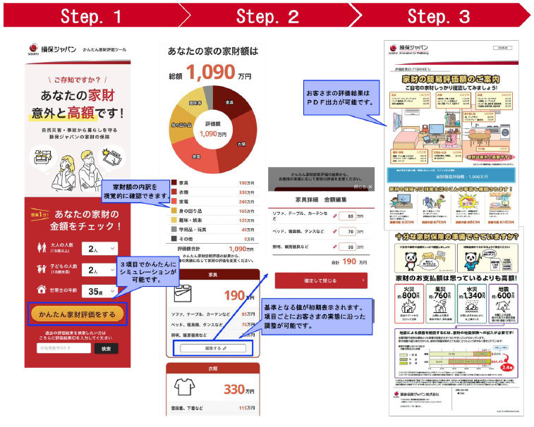 本ツールは、「お客さまの所有する家財」の評価額を可視化するオンラインツールであり、火災保険をご契約いただく際に、お客さまにとって納得感のある家財保険金額を設定することができます。スマホやパソコンで簡単に家財の評価額をシミュレーションし、『災害への備え』を後押しします。
