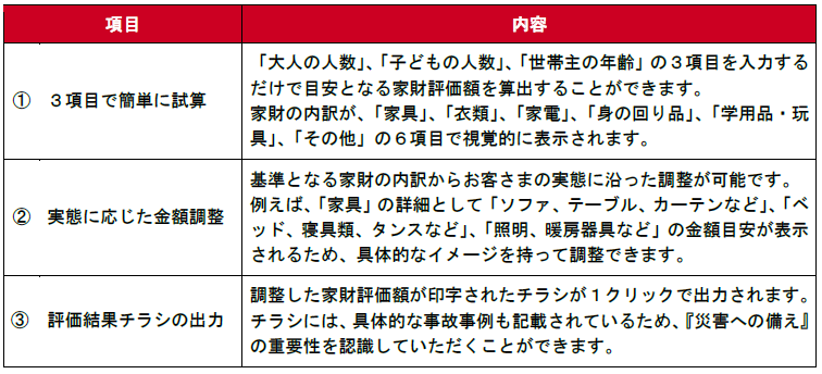 なお、損害保険会社によるお客さま自らが家財評価額を算出するためのツール提供は業界初となります。
