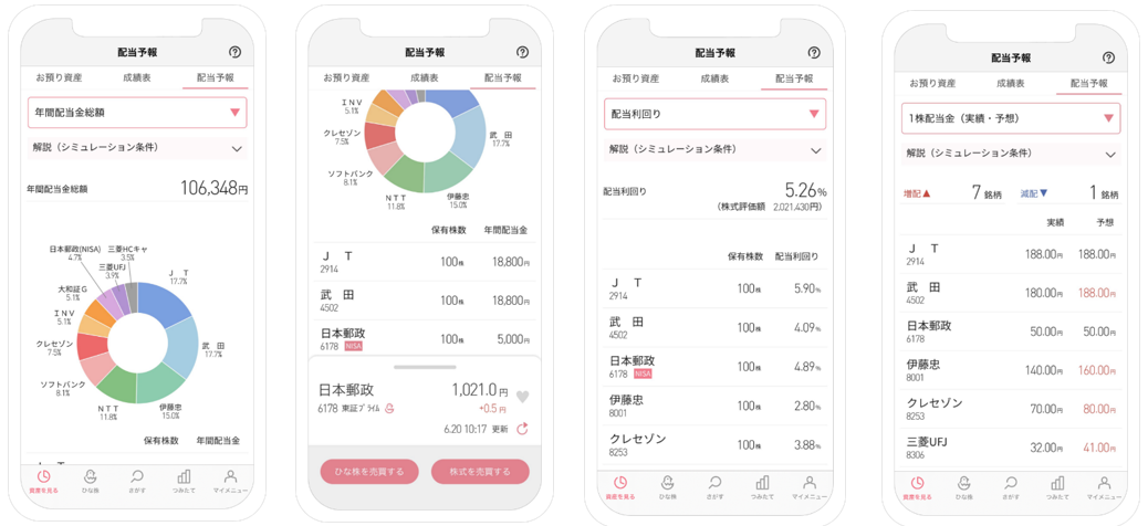 また、お客さまの保有株式に応じてリアルタイムに情報が更新されるので、ポートフォリオの見直しによる年間配当金総額の変化をカンタンに確認することができます。