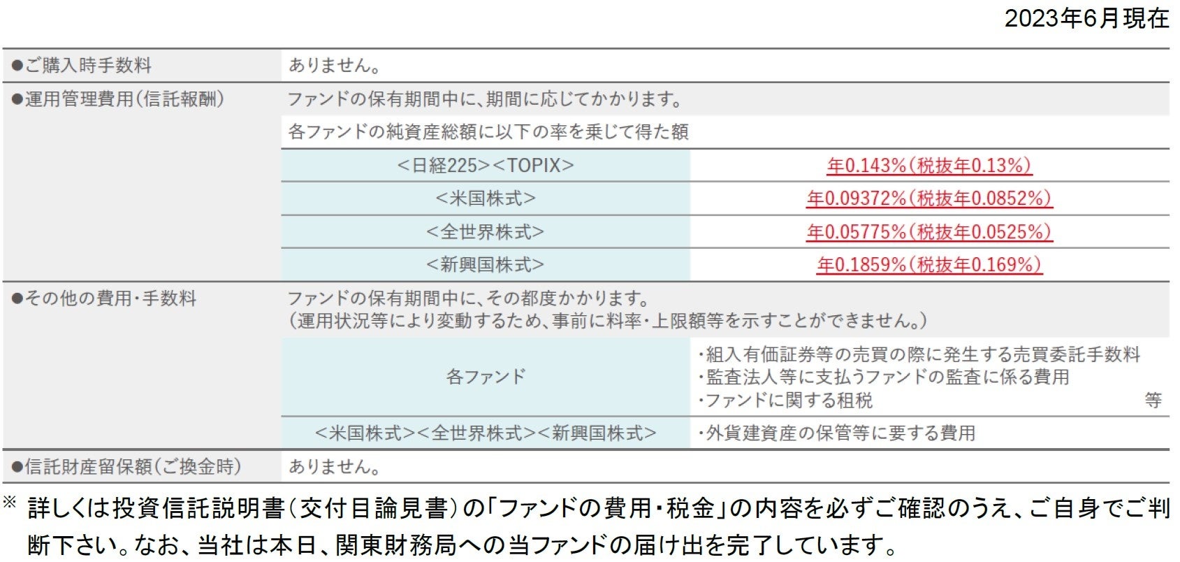 「はじめてのNISA・日本株式インデックス(日経225)」を<日経225>、「はじめてのNISA・日本株式インデックス(TOPIX)」を<TOPIX>、「はじめてのNISA・米国株式インデックス(S&P500)」を<米国株式>、「はじめてのNISA・全世界株式インデックス(オール・カントリー)」を<全世界株式>、「はじめてのNISA・新興国株式インデックス」を<新興国株式>と称する場合があります。