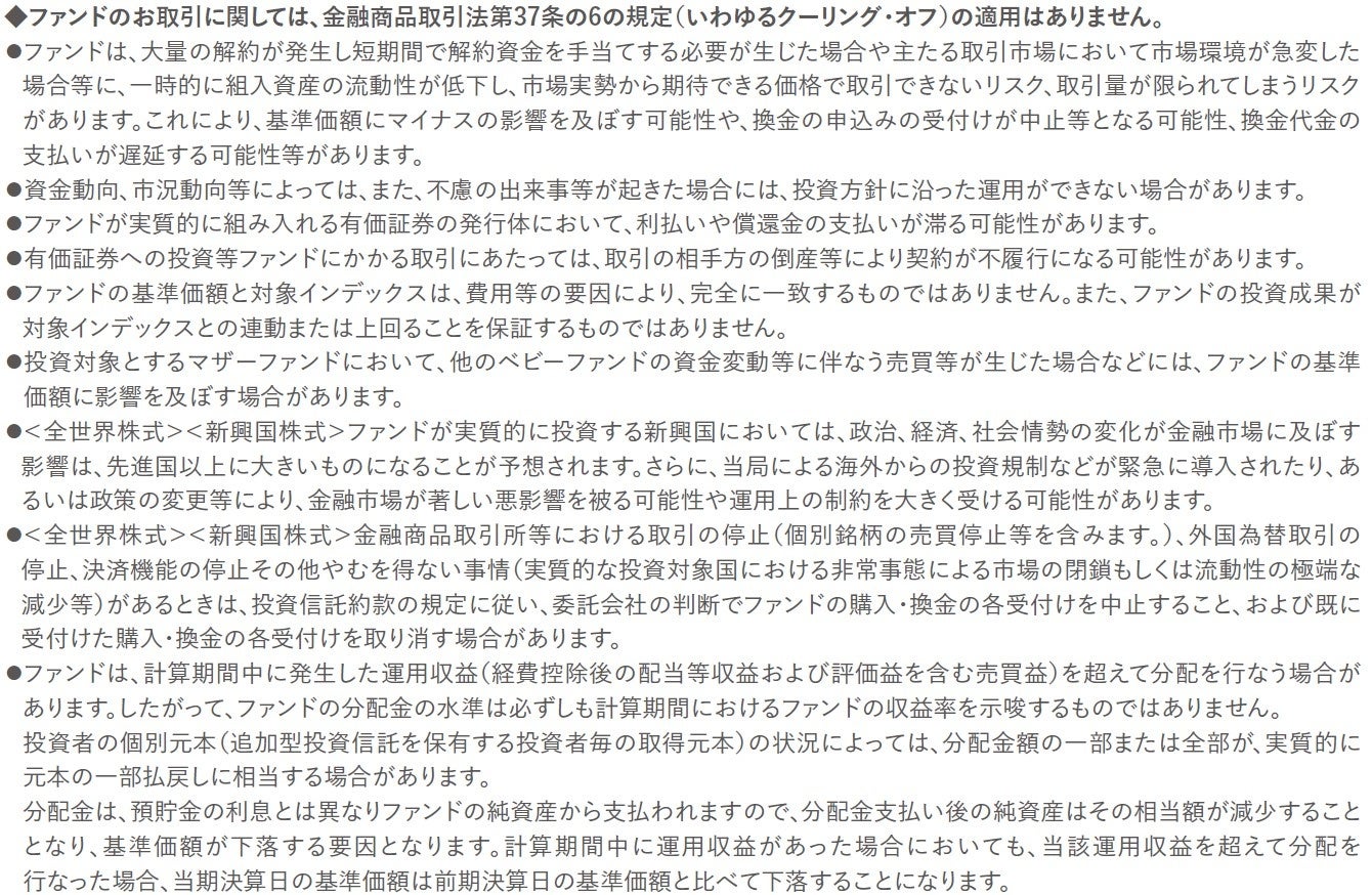 各ファンドは、株式等を実質的な投資対象としますので、組入株式の価格下落や、組入株式の発行会社の倒産や財務状況の悪化等の影響により、基準価額が下落することがあります。また、<米国株式><全世界株式><新興国株式>は外貨建資産に投資しますので、為替の変動により基準価額が下落することがあります。