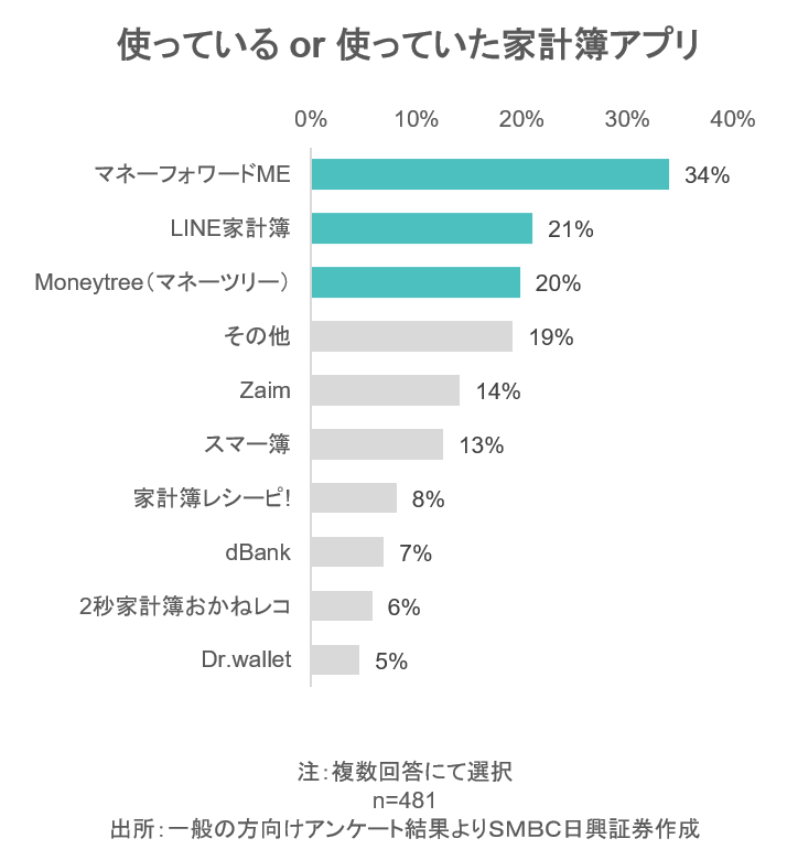 使っている/使っていた家計簿アプリ1位は34%「マネーフォワードME」、2位21%「LINE家計簿」、3位20%「Moneytree」