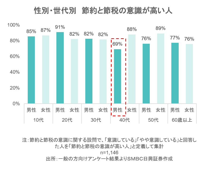 性別・世代別では、40代男性の「節約と節税の意識」が低かった。収入などに余裕ができることなどが要因の可能性