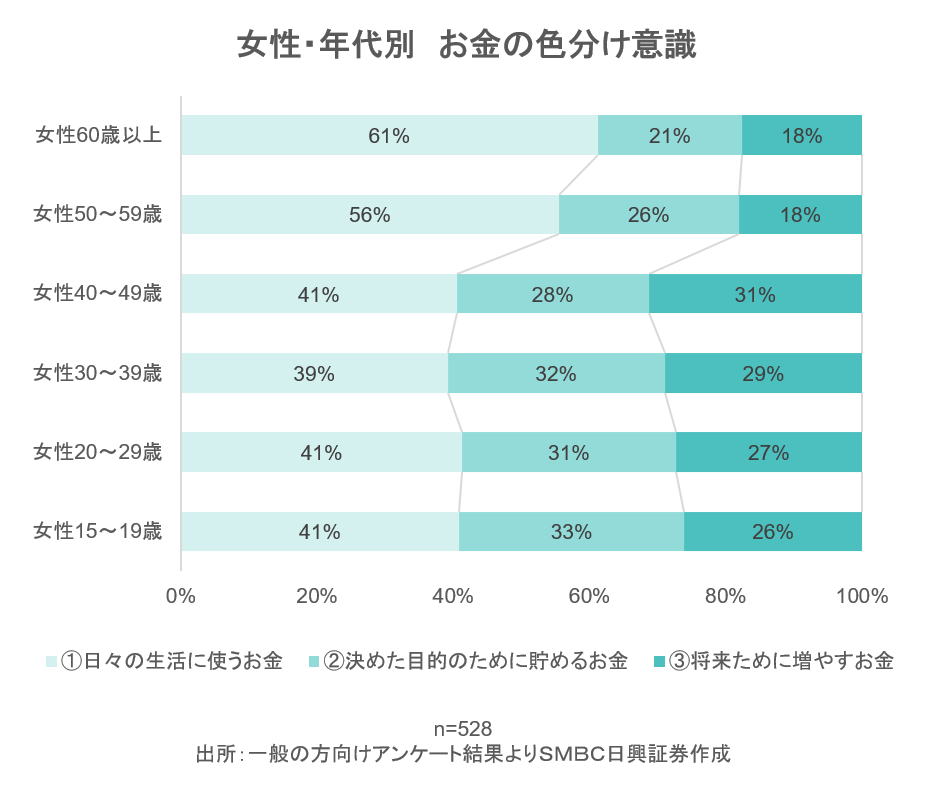 ・性別・世代別に見ると、男性・女性ともに年代が上がると「①日々の生活に使うお金」の割合が増え、「②決めた目的のために貯めるお金」や「③将来のために増やすお金」が減る傾向がある