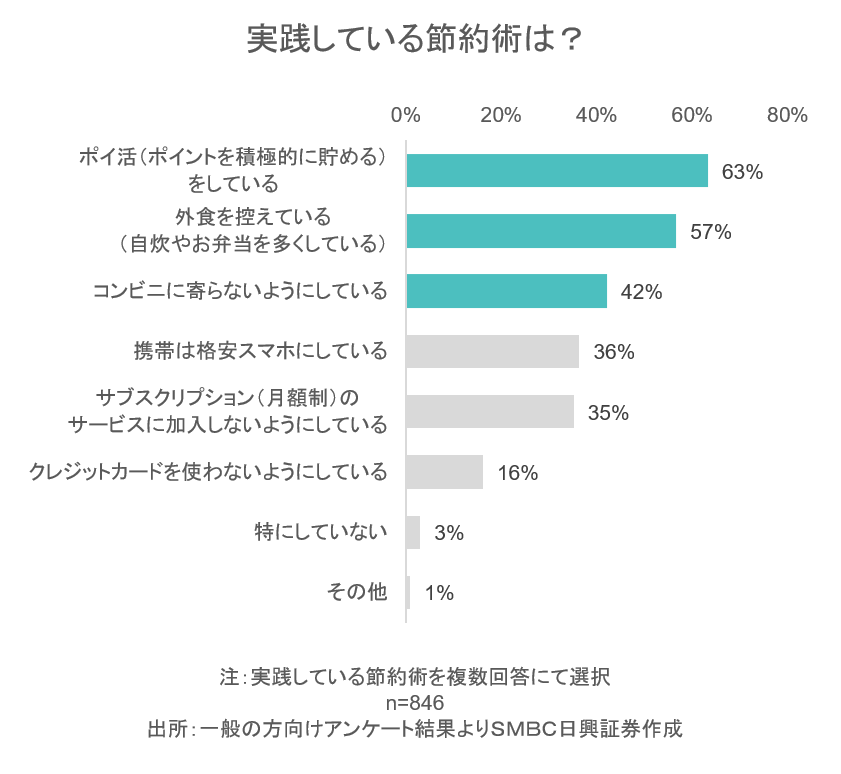 実践している節約術は、1位63%「ポイ活(ポイントを積極的に貯める)をしている」、2位57%「外食を控えている(自炊やお弁当を多くしている)」、3位42%「コンビニに寄らないようにしている」(複数回答)
