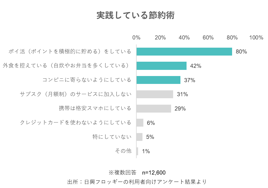 実践している節約術は、1位80%「ポイ活(ポイントを積極的に貯める)をしている」、2位42%「外食を控えている(自炊やお弁当を多くしている)」、3位37%「コンビニに寄らないようにしている」(複数回答)