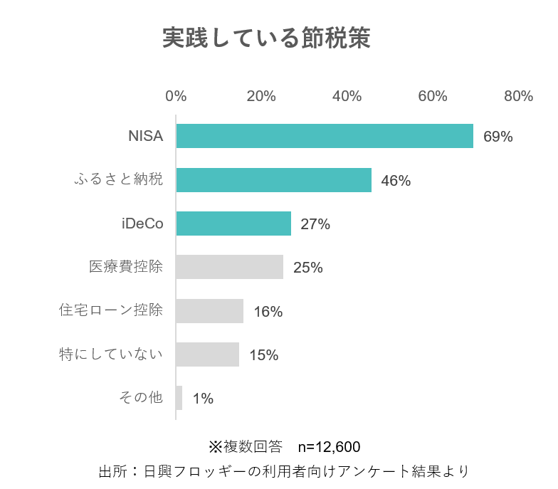実践している節税策は、1位69%「NISA」、2位46%「ふるさと納税」、3位27%「iDeCo」(複数回答)