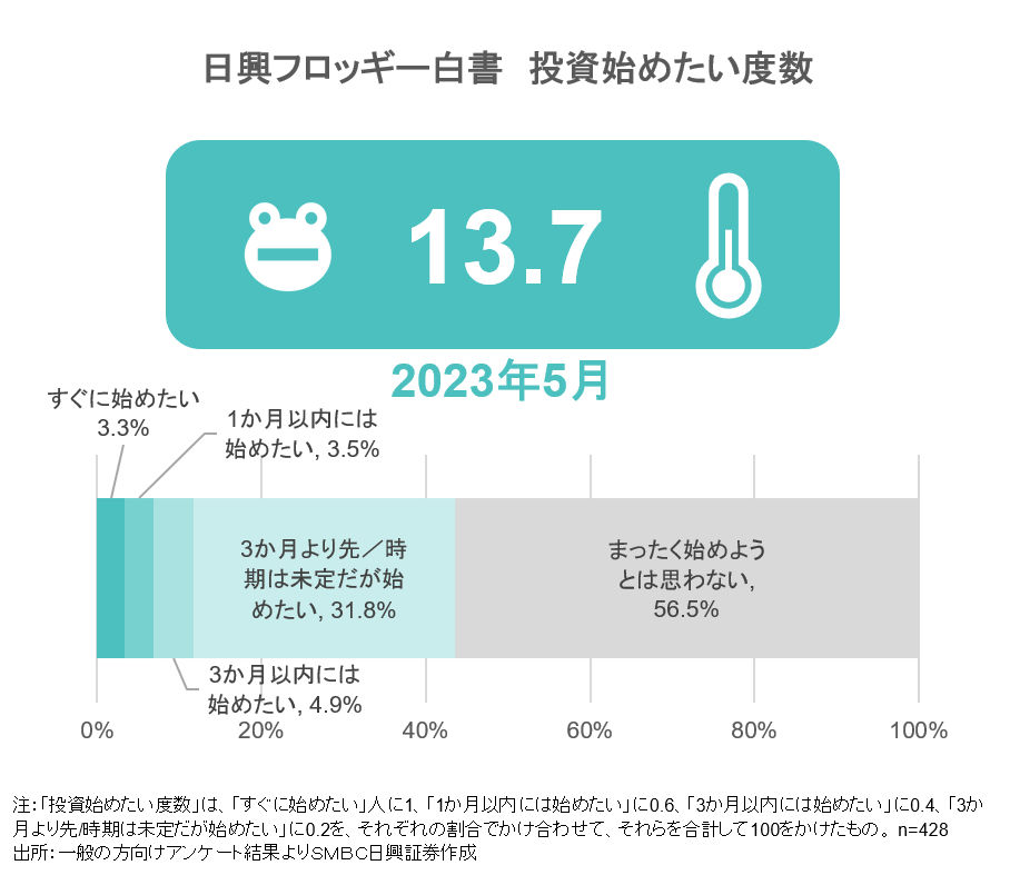 2023年5月の日興フロッギーが算出する「投資始めたい度数」は13.7と上昇しました(前回23年2月:12.7)