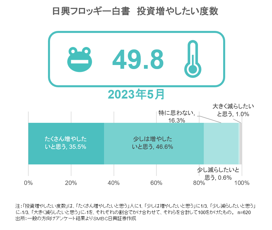 2023年5月の日興フロッギーが算出する「投資増やしたい度数」は49.8と上昇しました(前回23年2月:46.7)