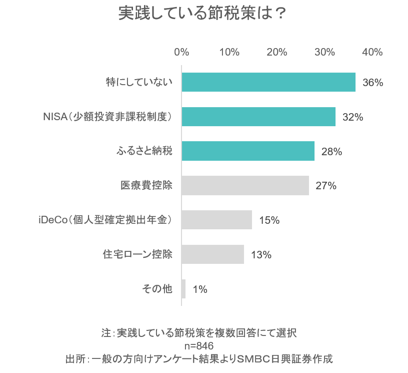 ・実践している節税策は、1位「特にしていない」36%、2位「NISA」32%、3位「ふるさと納税」28%(複数回答)