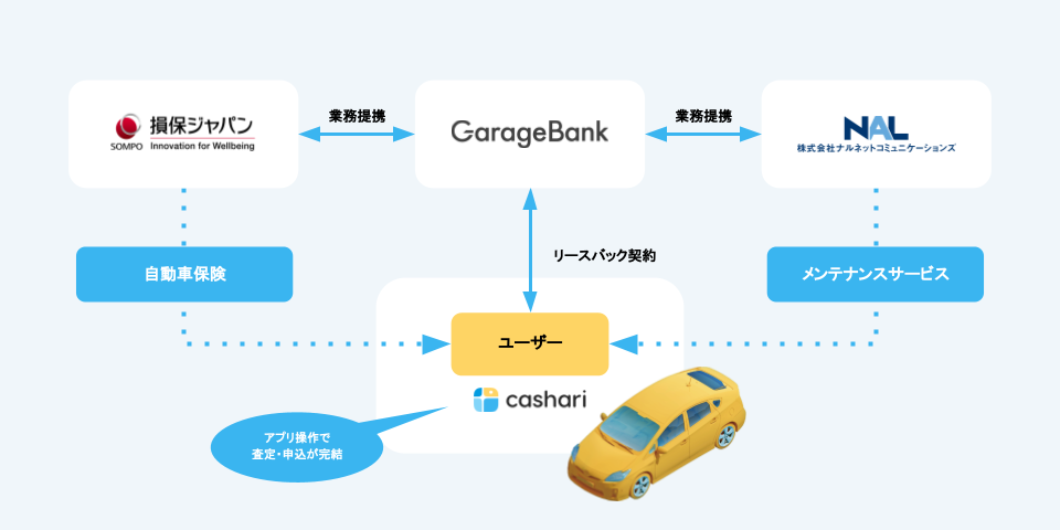 ナルネットコミュニケーションズは、「cashari / カシャリ」マイカーリースバック向けに専用メンテナンスパックをガレージバンクおよび損害保険ジャパン株式会社(本社:東京都新宿区、取締役社長:白川儀一、以下 損保ジャパン)と専用開発しました。