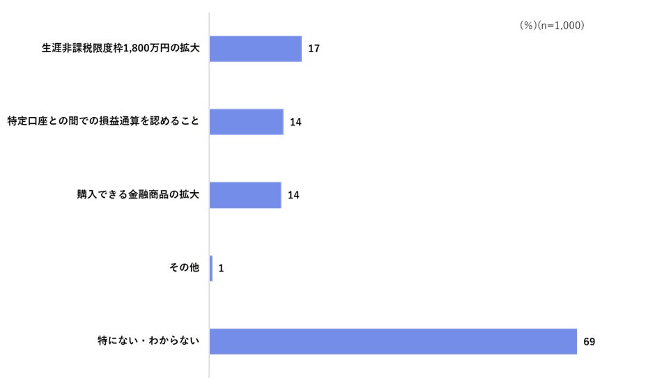 新NISA制度について、改善が必要と考える点を新NISA制度を知らない方も含め聴取したところ、「生涯非課税限度枠1,800万円の拡大」が17%となった。