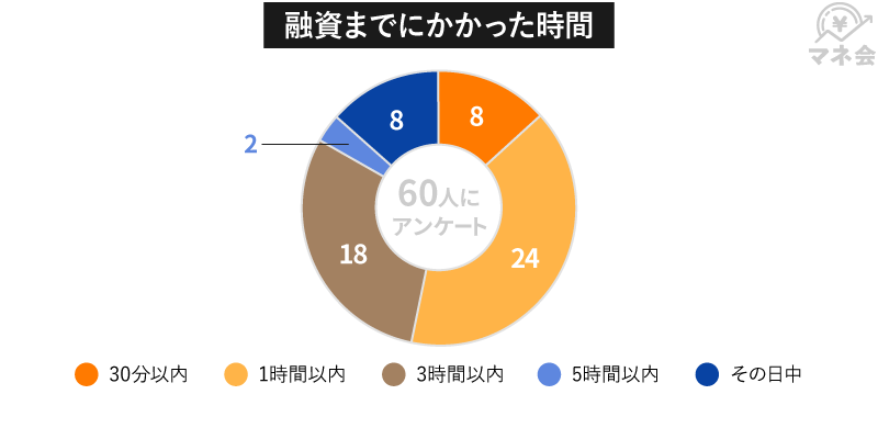 今回の調査では、多くの方が大手消費者金融を選んでいるため、大手消費者金融では概ね1時間以内で借りられることがわかりました。
