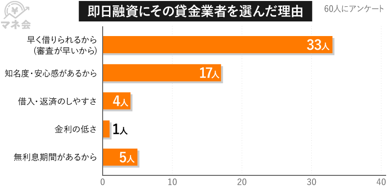 貸金業者の選定理由の1位は当然ながら「早く借りられるから(審査が早いから)」となり、その数は半数以上でした。