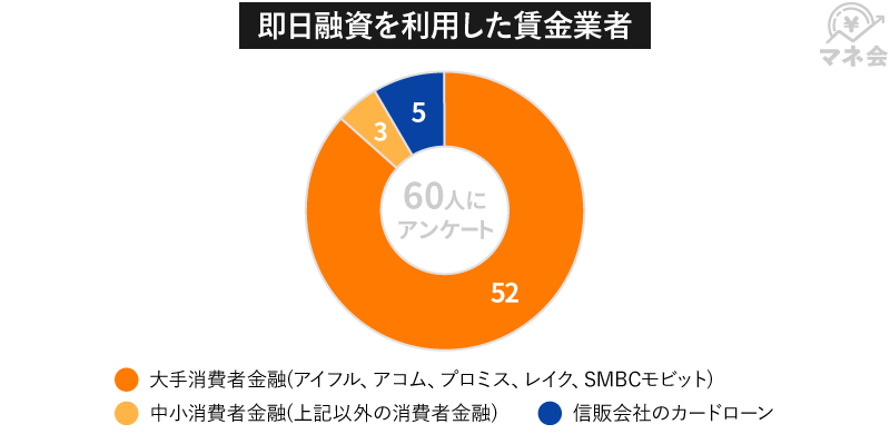 マネ会編集部が即日融資でお金を借りたことがある方60名の方にアンケートと取ったところ、一番利用されているのは大手消費者金融ということがわかりました。
