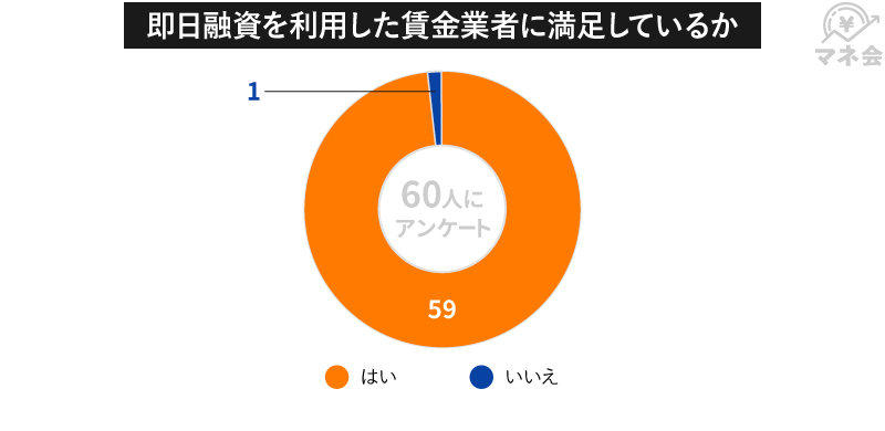 今回の調査では1名を除く59名が即日融資を受けた貸金業者に満足していると回答。