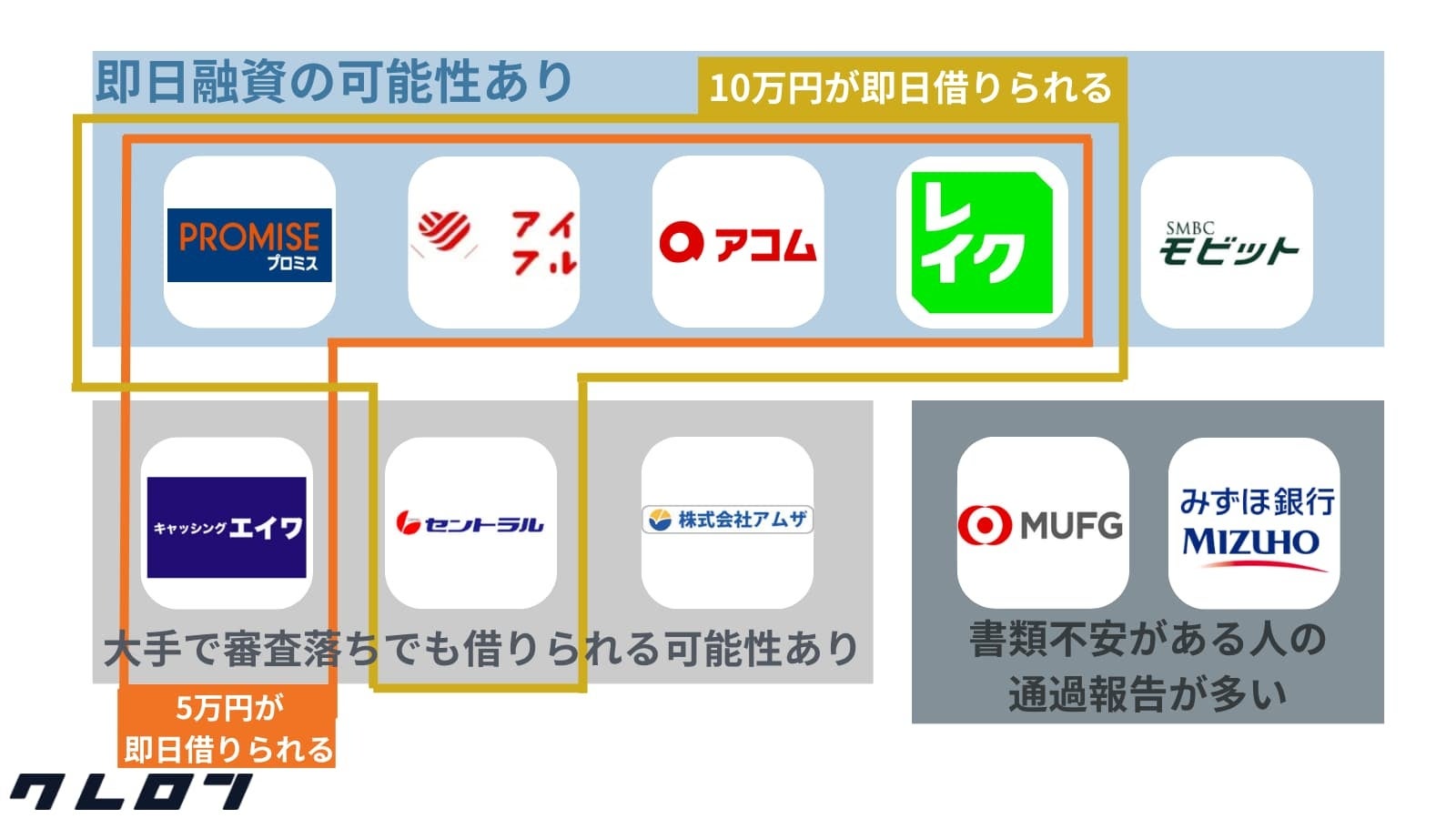 10万円が即日に借りられる→プロミス、アイフル、アコム、レイク、セントラル