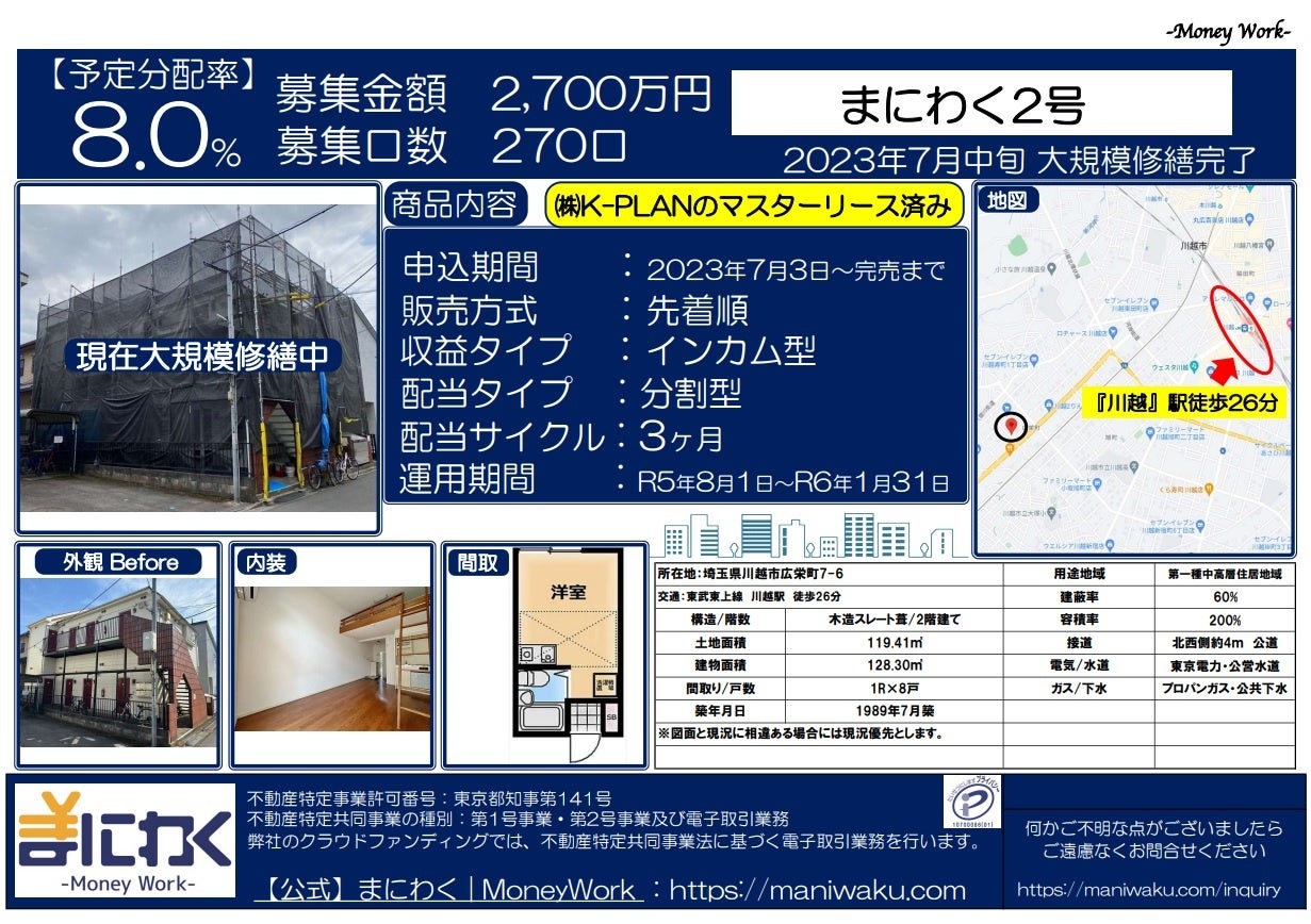そこで「まにわく2号ファンド」1号ファンド同様に、創業来、取り組んできたアパート再生事業案件を組成いたします。