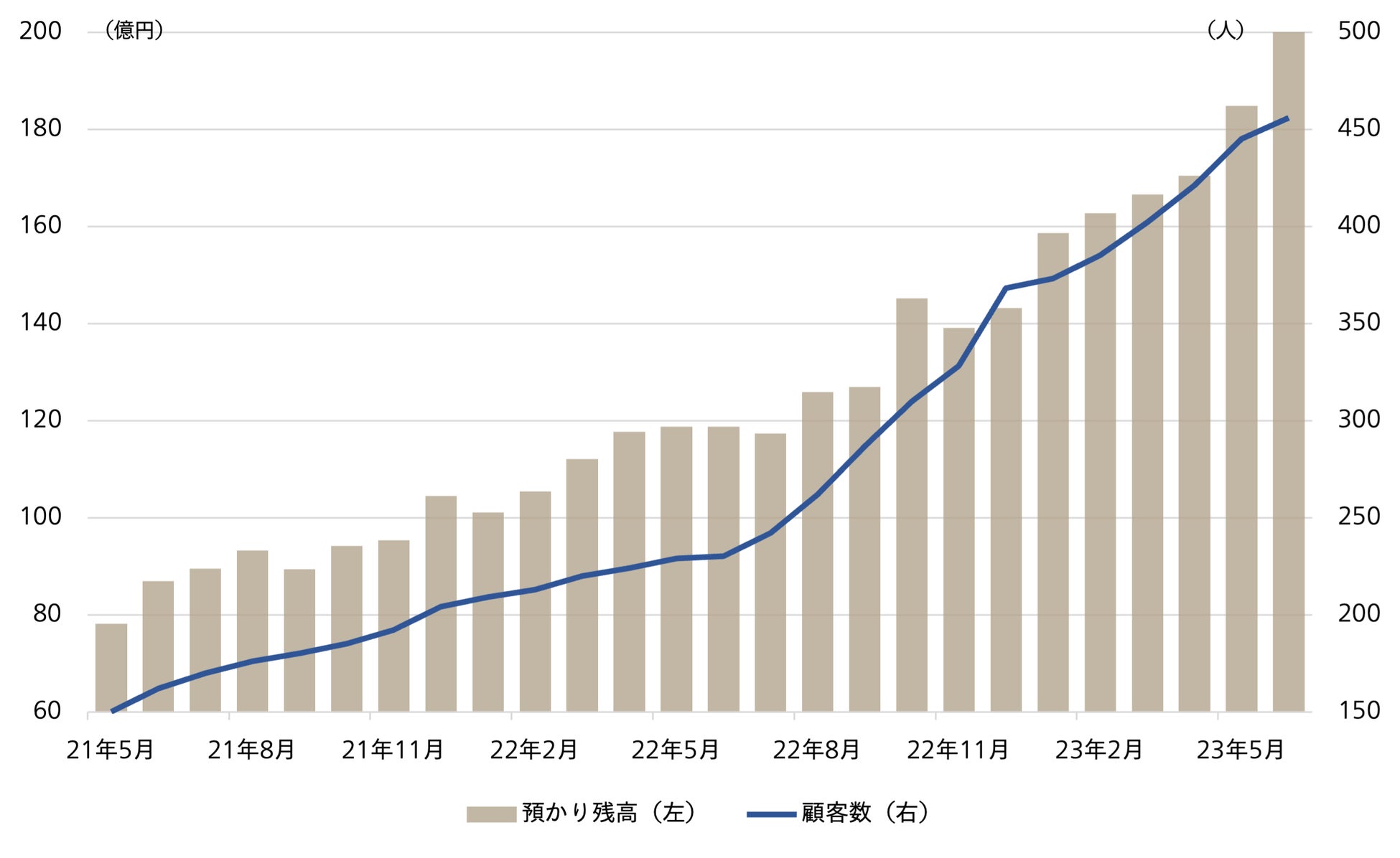 IFA Leadingでは、「新たな”お金の循環”から生まれる豊かな世界の実現」をビジョンに掲げ、2022年6月に金融商品仲介業を開始以来、お客様の幅広い資産運用ニーズにお応えできるよう、金融機関との提携拡大をはじめ積極的なサービス拡充を図り、預かり資産、顧客数共に拡大をしてまいりました。そしてこのたび、お客様をはじめパートナーのみなさまなど多くの方々のご支援により、サービスを開始して1周年を迎えた23年6月に仲介する総預かり資産が200億円を突破いたしました。