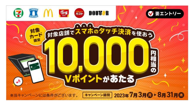 キャンペーン期間中、対象店舗で1回あたり1,000円(税込)以上のスマホのタッチ決済ご利用を1口として、抽選で1,000名に10,000円相当のVポイントをプレゼントいたします。