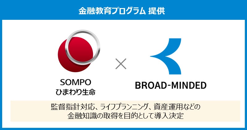 「金融の力を解き放つ」をパーパスに掲げ、保険・証券・住宅ローンと複数の金融商品を横断して1社で取り扱い、人々のライフプラン実現をサポートするブロードマインド株式会社(本社:東京都渋谷区 代表取締役社長:伊藤清 以下:ブロードマインド)は、SOMPOひまわり生命保険株式会社(本社:東京都新宿区 代表取締役社長 CEO:大場康弘 以下:SOMPOひまわり生命)に対し、7月1日より金融教育プログラムを提供いたします。