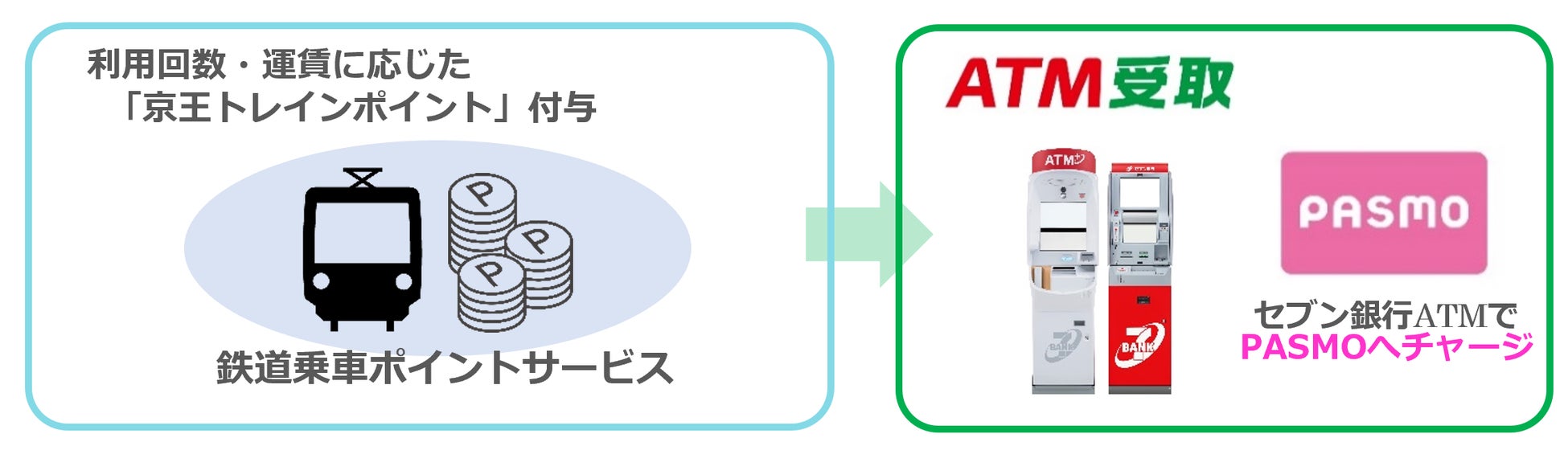 本合意により、セブン・ペイメントサービスが提供する「ATM受取(電子マネーコース)」を通じて鉄道乗車によって貯まった「京王トレインポイント」をセブン銀行ATMで原則24時間365日、PASMOへチャージすることができるようになります。