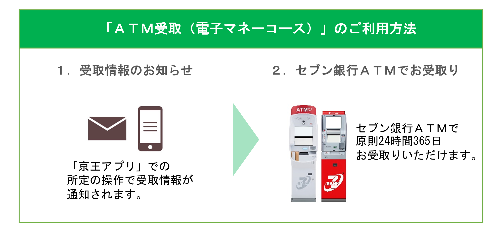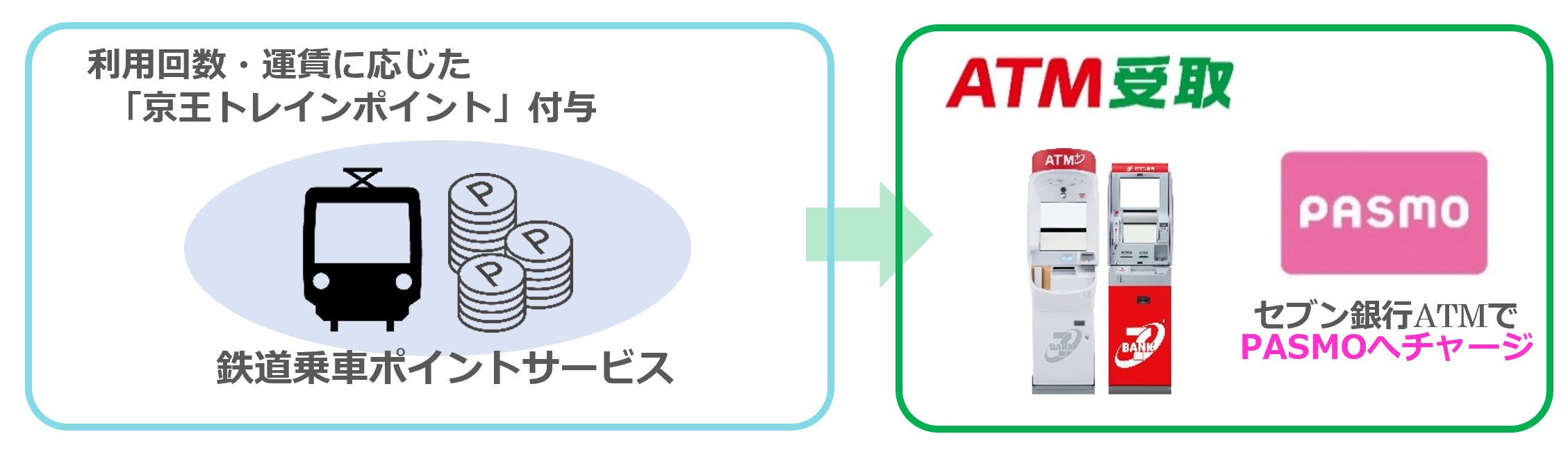 本合意により、セブン・ペイメントサービスが提供する「ATM受取(電子マネーコース)」を通じて鉄道乗車によって貯まった「京王トレインポイント」をセブン銀行ATMで原則24時間365日、PASMOへチャージすることができるようになります。