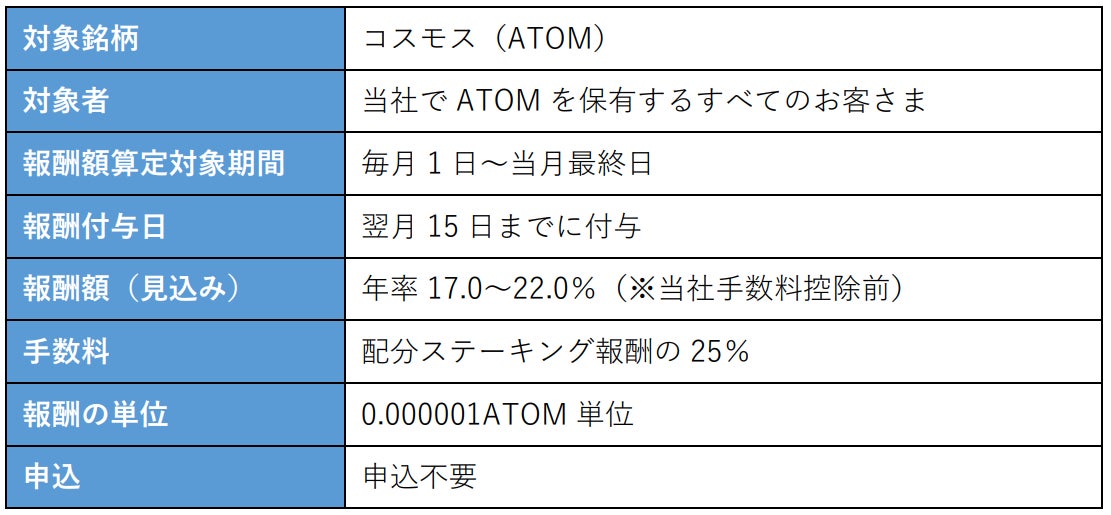 ATOMのステーキング報酬については、当社で獲得した月次のステーキング報酬実績に応じた額をお客様に付与させていただきますが、現時点では当社ステーキング取扱銘柄の中でも最高水準である年率17.0~22.0%(※当社手数料控除前)程度を見込んでおります。なお入庫につきましては、当社で別途設定する一定数量より対応させていただきます(特別入庫対応)。