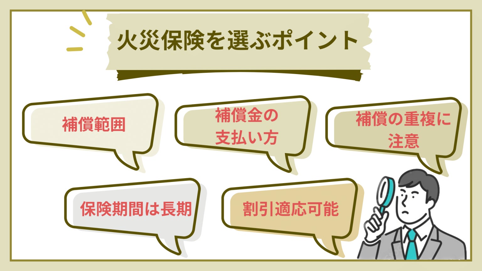 膨大な時間を省略しながら、自分にあった火災保険を見つけてもらうために、火災保険選びの5大ポイントを作成しました。