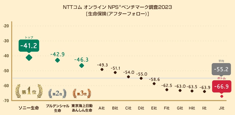 対象の生命保険会社13社のうち、生命保険におけるアフターフォロー体験に対するNPSのトップはソニー生命(-41.2ポイント)、2位はプルデンシャル生命(-42.9ポイント)、3位は東京海上日動あんしん生命(-46.3ポイント)となりました。対象13社のNPS平均は-55.2ポイント、またトップ企業とボトム企業との差は25.7ポイントとなりました。