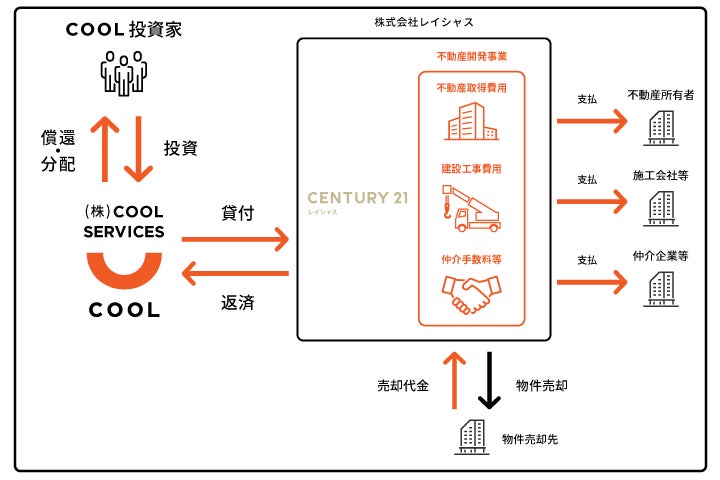 お客様より投資いただいた当ファンドの資金は、同じくZUUグループに属する貸金業者である株式会社COOL SERVICES(東京都世田谷区:代表取締役 伊藤 謙)からセンチュリー21レイシャスに対して貸し付けられ、センチュリー21レイシャスが展開する不動産開発事業に係る資金として使用されます。