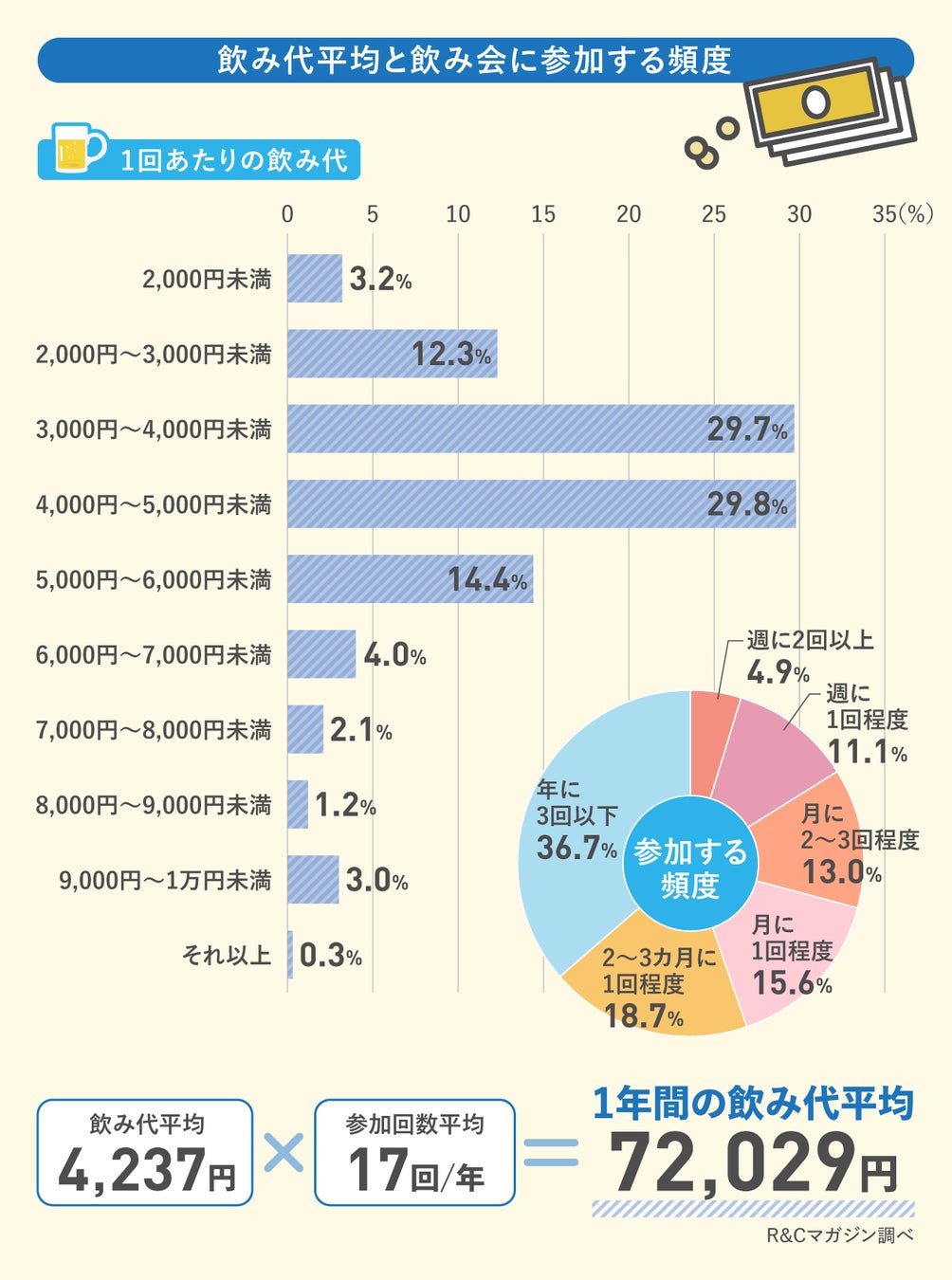 飲み会1回あたりの飲み代の平均は4,237円で、参加回数は年に17回だということがわかりました。