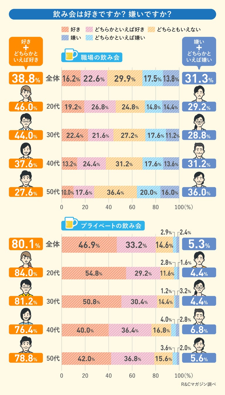 そこで「飲み会は好きですか?」と質問したところ、職場の飲み会、プライベートの飲み会ともに「好き」「どちらかといえば好き」と回答したのは20代の割合が高くなりました。