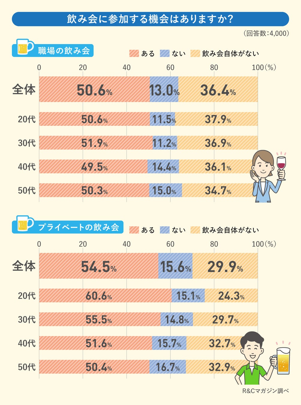 職場の飲み会には全年代では50.6%が「参加する機会がある」と回答。36.4%が「飲み会自体がない」と回答しました。