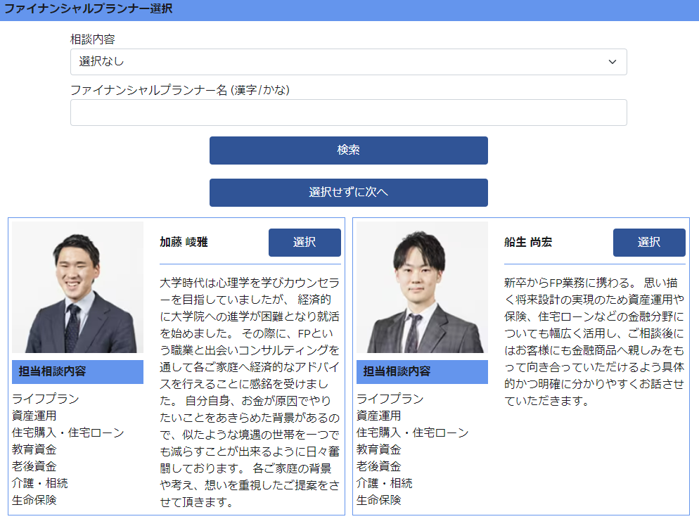 FPの担当相談内容も記載されているため、ご自身が特にご相談されたい内容に合わせて担当FPを指名