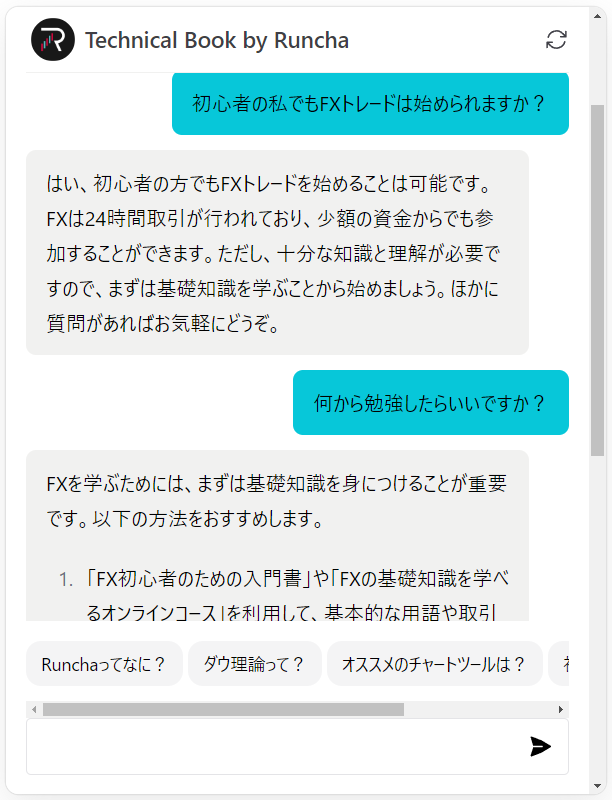 『テクニカルブック』は、株・FX・仮想通貨などの投資に欠かせない、テクニカル分析を専門的に扱うサイトです。このたび『テクニカルブック』は、投資に関する質問に、AIが回答するチャットボット(chatBOT)を導入しました。「初心者は何から学ぶべき?」や「ゴトウビの仲値トレードとは?」などの質問に、『テクニカルブック』の情報を網羅するAIが回答。投資の不安を解消して、トレードのサポートを行います。