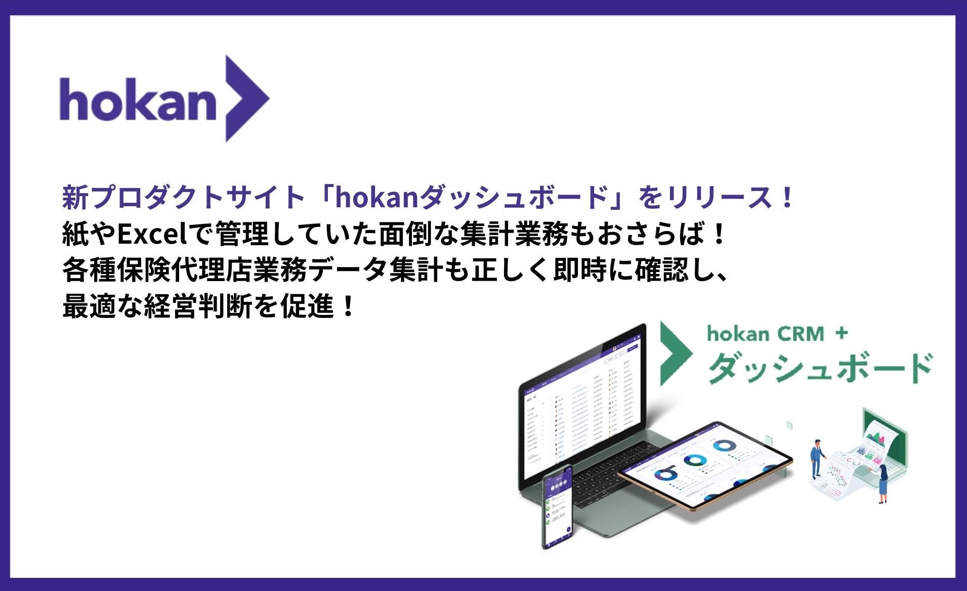「適正な営業活動」と「組織の強固な監査体制」を実現するクラウド型保険代理店システム「hokan」を提供する株式会社hokan(ホカン、本社:東京都中央区、代表取締役:小坂直之) から、保険代理店の手数料集計分析業務だけでなく顧客属性分析や業務分析も可視化したデータで最適な経営判断を促進するプロダクト「hokanダッシュボード」のサイトリリースをお知らせします。