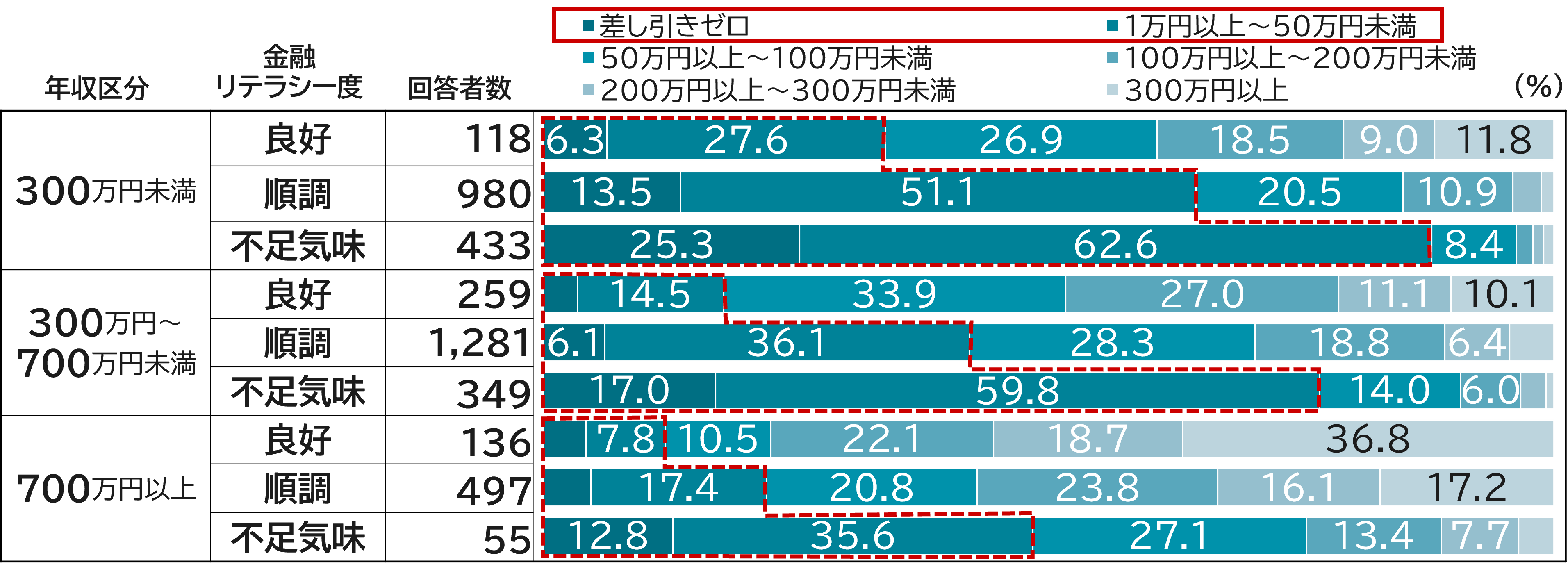 続いて、「年間の資産形成額」と「金融リテラシー度」について分析してみると、年収区分に関係なく資産形成額が「差し引きゼロ」「1万円以上~50万円未満」と回答した人の割合は、「金融リテラシー度」が高くなるにつれて減少していることがわかりました。結果として「金融リテラシー度」が高い人の方が、年間の資産形成額も多くなっている傾向が見られました【図表4】。