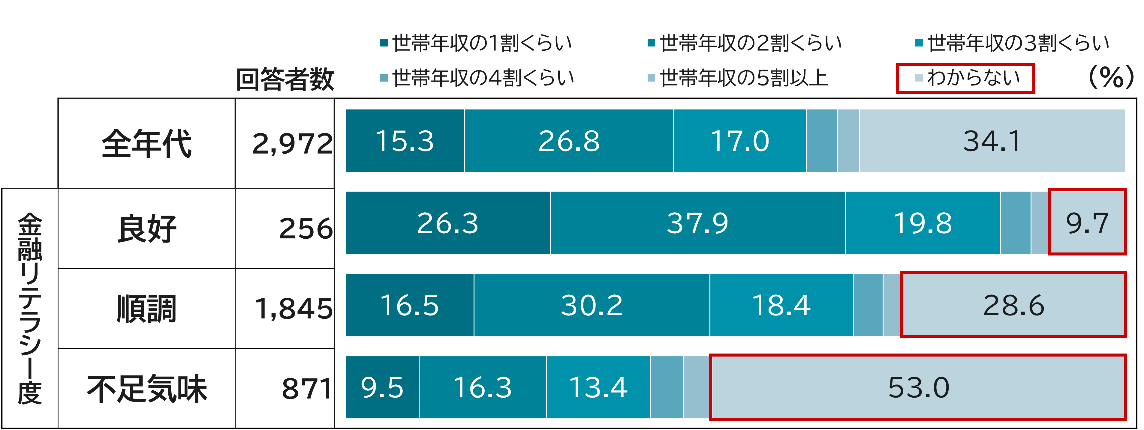 住まいの選択に関連して、「年収に占める住宅ローン返済割合」を住宅ローン利用中(または過去に利用経験あり)の方に伺ってみたところ、「わからない」と回答している人の割合に特徴がみられました。「金融リテラシー度」が高くなるにつれて返済割合が「わからない」と回答した人の割合が大きく減少しており、「金融リテラシー度」が高い人ほど、自身の住宅ローンの返済内容をきちんと認識している傾向がみられました【図表6】。