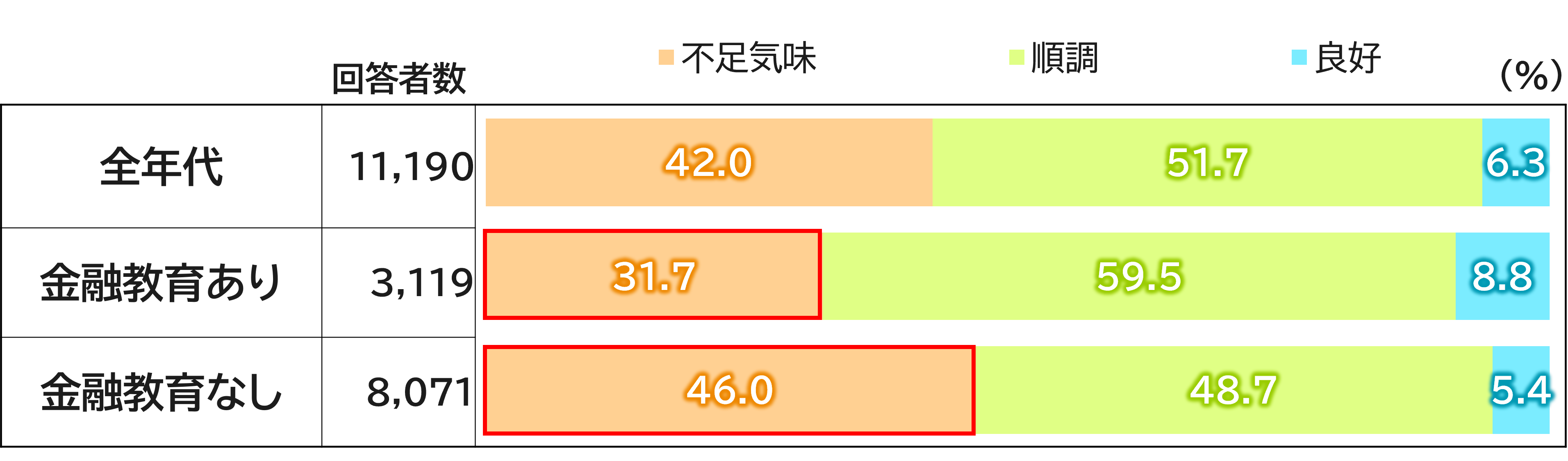 スコア化した「金融リテラシー度」を各属性設問とクロス集計することで、「金融リテラシー度」が高い人の特徴を分析しました。まずは金融教育経験と「金融リテラシー度」についてですが、「金融教育あり」と回答した人は、「金融教育なし」と回答した人よりも「金融リテラシー度:不足気味」の割合が14.3%少ない結果となり、全体的に金融教育経験がある人はない人に比べて「金融リテラシー度」が高い傾向となりました【図表2】。