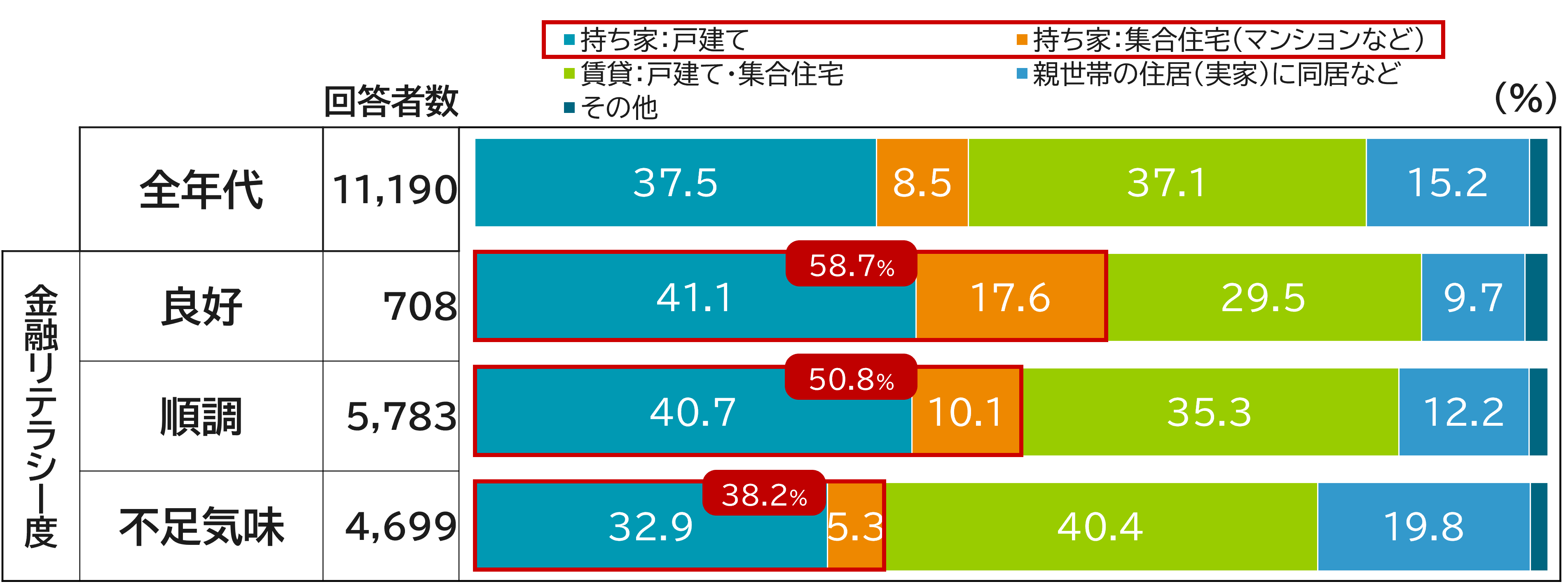 続いて、回答者の「住まいの選択」と「金融リテラシー度」を分析してみたところ、住まいを「持ち家」と回答している人の割合は「金融リテラシー度」が「良好:58.7%」、「順調:50.8%」、「不足気味:38.2%」となり、結果として「金融リテラシー度」が高い人ほど、持ち家を選択する人の割合が増加している傾向がみられました【図表5】。