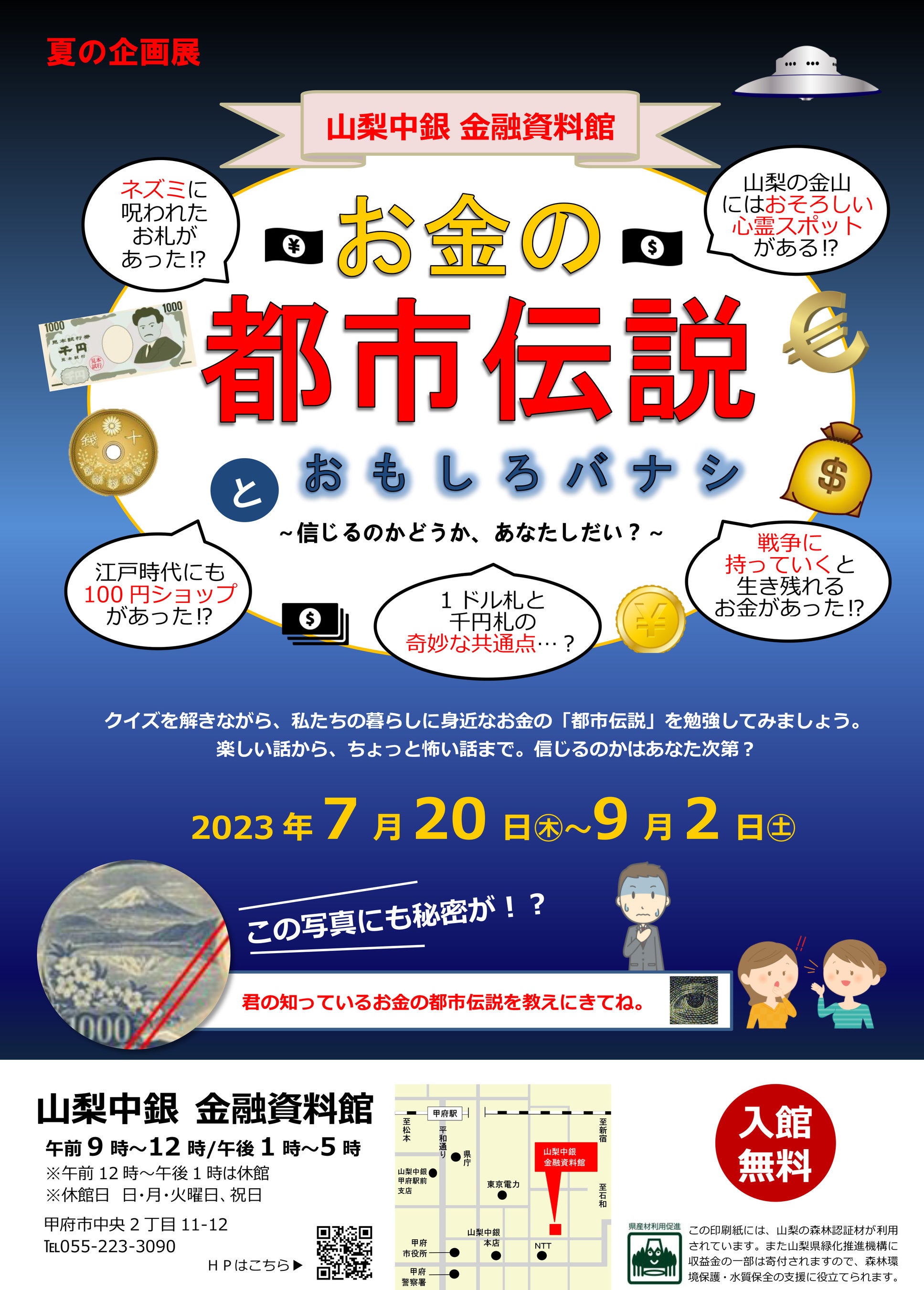 株式会社山梨中央銀行(頭取 古屋 賀章)は、山梨中央銀行金融資料館において、夏休み特別企画「お金の都市伝説とおもしろバナシ~信じるのかどうか、あなたしだい?~」を開催しております。
