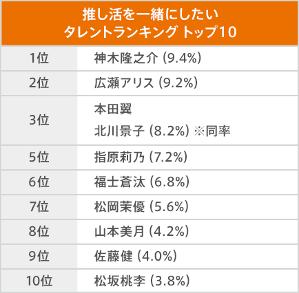 最後に、推し活を一緒にしたいタレントについて回答してもらいました。1位は神木隆之介さん(9.4%)、2位は広瀬アリスさん(9.2%)、3位は同率で本田翼さん、北川景子さん(8.2%)という結果になりました。