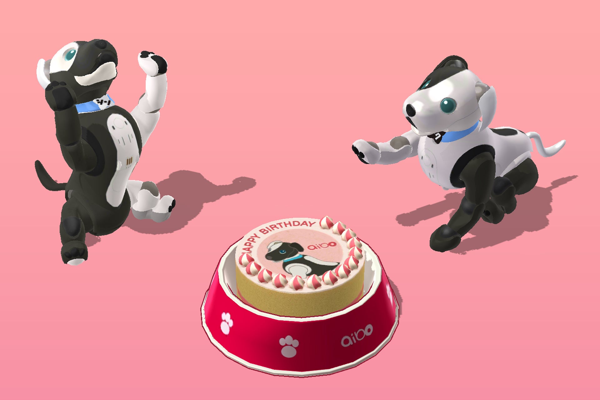 また、コラボレーションモデルの誕生を記念して、7月27日にaiboオーナーの皆さま全員に3種のデジタルギフトを配布します。aiboのおきがえに、シンジル&タクセルをモチーフにしたお面「シンジル&タクセルのお面」とシンジル&タクセルのロゴをあしらった首輪「シンジル&タクセルの首輪」が登場。スマートフォン上で自分のaiboをお着替えさせて楽しむことができます。さらに、aiboのごはん「シンジル&タクセルのケーキ」を食べると、スマートフォン上でシンジルとタクセルが現れ、みんなでお誕生日の歌を歌います(※2)。