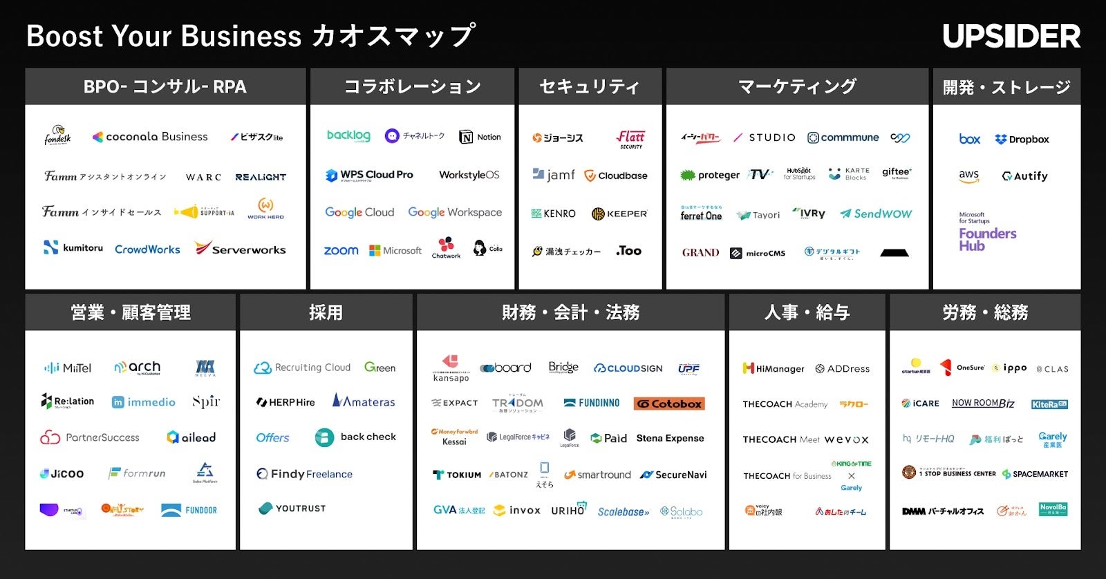 2022年11月の提供開始後、多くのUPSIDER利用企業様より好評を頂いているリワードプログラム「Boost Your Business」。ご好評にお応えする形で、ご参画いただくサービスのラインナップも幅を広げてまいりました。120を超えるサービスをお得なプランで提供できるようになったことに合わせ、「Boost Your Business カオスマップ」を公開します。