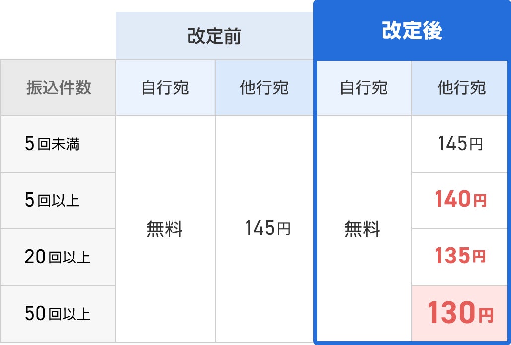 本改定により、振込件数に応じてよりお得に振込をご利用いただくことが可能となり、さらに多くのお客さまにご参加いただきやすいプログラムとなります。
