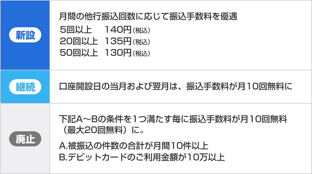 なお、新規に口座開設されたお客さまに対する「口座開設日の当月および翌月は、振込手数料が月10回無料」プログラムは継続いたします。