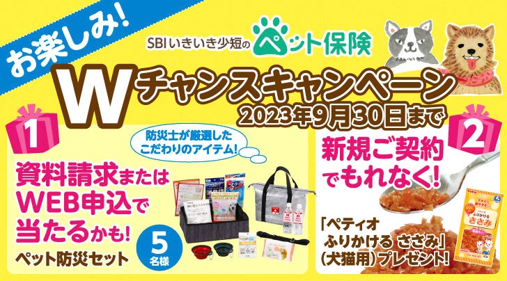 SBIいきいき少額短期保険株式会社(本社:東京都港区、代表取締役社長:採田 祐治、以下「当社」)は、ペット保険の資料請求またはWEB申込をされた方、新規ご契約いただいた方、それぞれを対象としたプレゼントキャンペーンを実施します。