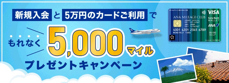 ソニー銀行株式会社(代表取締役社長:南 啓二/本社:東京都千代田区/以下 ソニー銀行)は、全日本空輸株式会社(代表取締役社長:井上 慎一/本社:東京都港区/以下 ANA)と「新規入会と5万円のカードご利用でもれなく5,000マイルプレゼントキャンペーン」を2023年8月1日(火)より実施しますのでお知らせいたします。